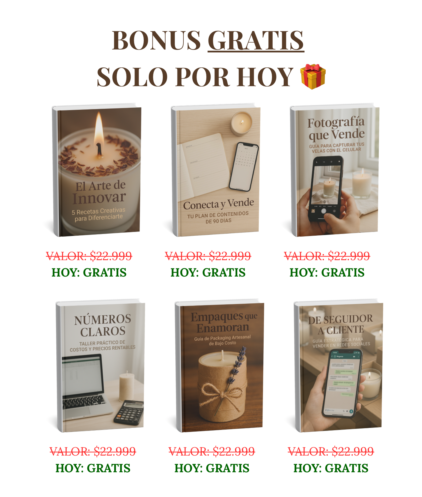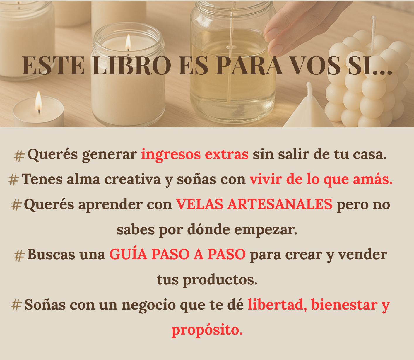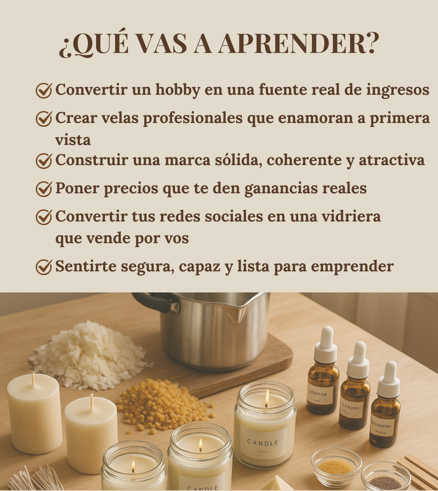 "En solo 2 semanas ya tenía mi primera tanda de velas vendidas. Las recetas son clarísimas y los consejos de marketing me ayudaron a posicionarme."